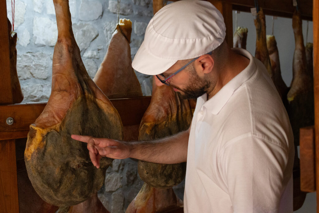 Prodotto secondo una tradizione secolare, il prosciutto viene lavorato a mano: rifilatura, salatura su tavole inclinate, pressatura in torchio di legno e speziatura con pepe nero e peperoncino. Dopo l’asciugatura, le cosce riposano fino a 24 mesi in cantine in pietra, ventilate dai venti del Matese.